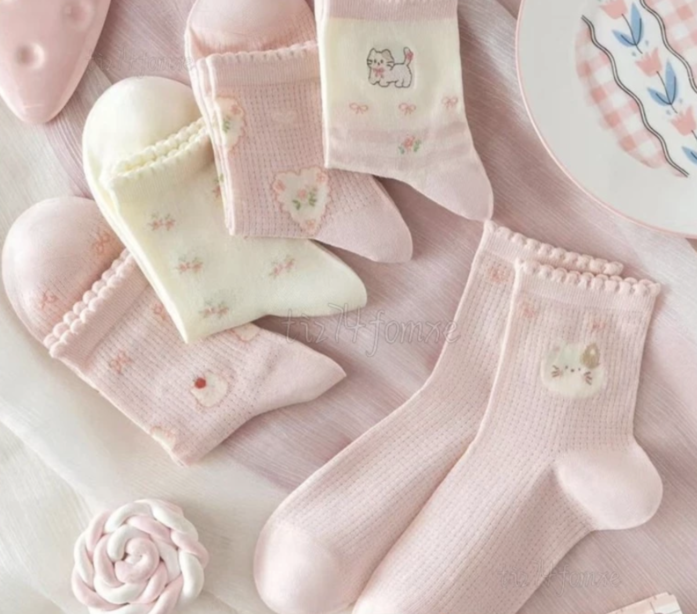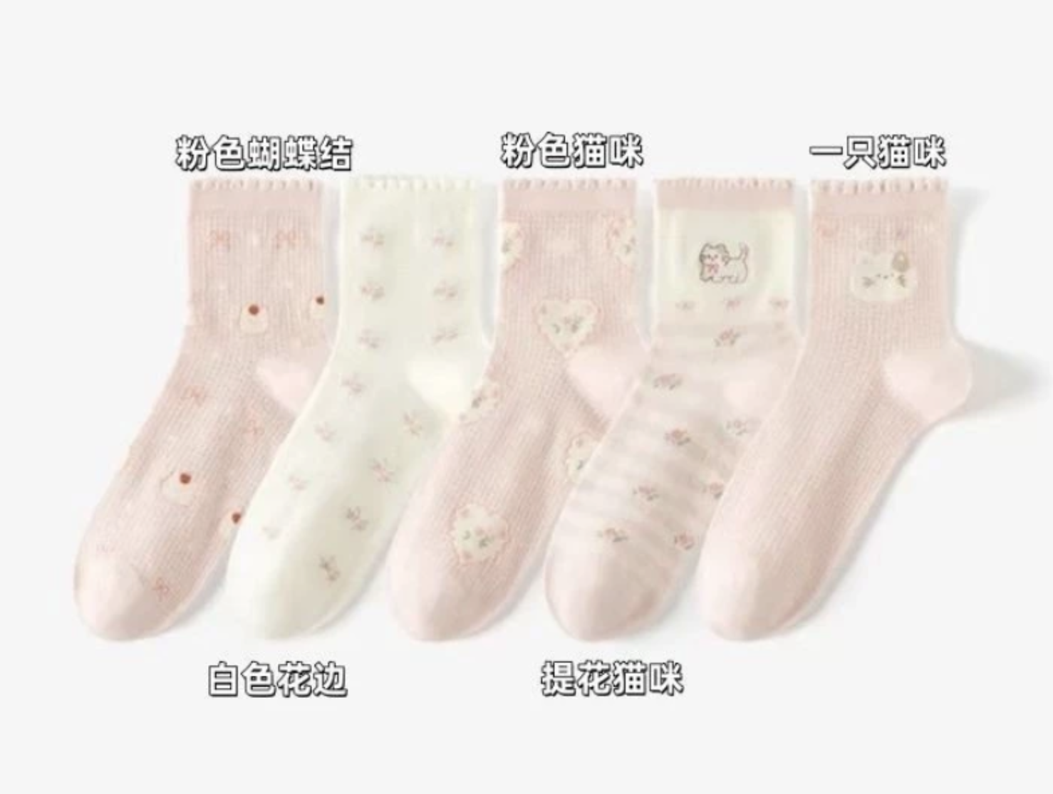 五款各一雙, 粉色蝴蝶結, 白色花邊, 粉色貓咪, 緹花貓咪, 一隻貓咪