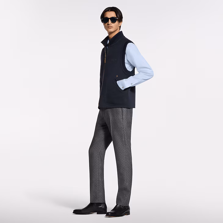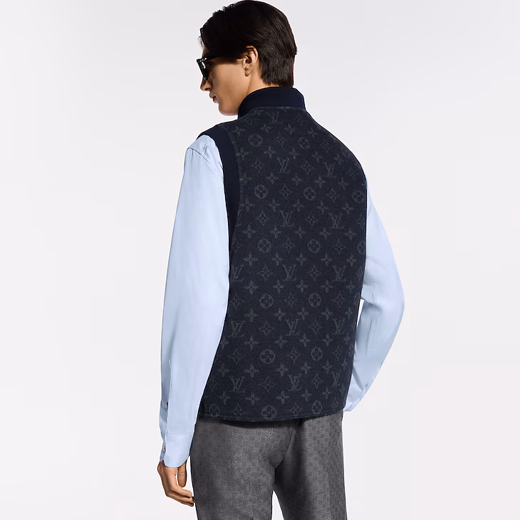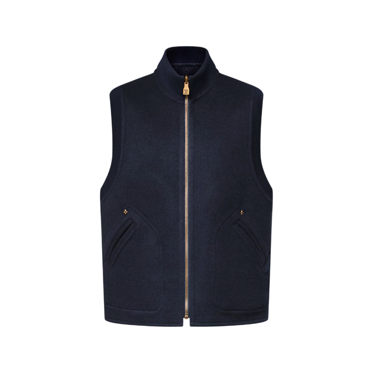 這款可雙面穿著的navy藍背心是換季時節的理想中層單品,無論搭配襯衫或套頭衫,亦可內搭於外套之下。採用雙面布料精製而成,選用溫暖奢華的羊毛混紡,彰顯非凡品味。 山羊絨與絲質一面採用雋永素色設計,胸前以低調萊因石點綴,細節精緻含蓄 口袋上飾有LV花卉鉚釘,背面配以皮革貼章同色調提花Monogram圖案主飾,為背面增添型格視覺點綴。
